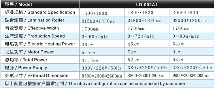 | 汽車用品復(fù)合機(jī)/貼合機(jī)-橫式單槽水膠網(wǎng)帶復(fù)合機(jī)/貼合機(jī)LD-002A1主要技術(shù)參數(shù) / Major technical parameters |